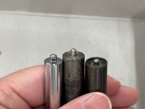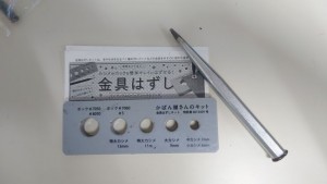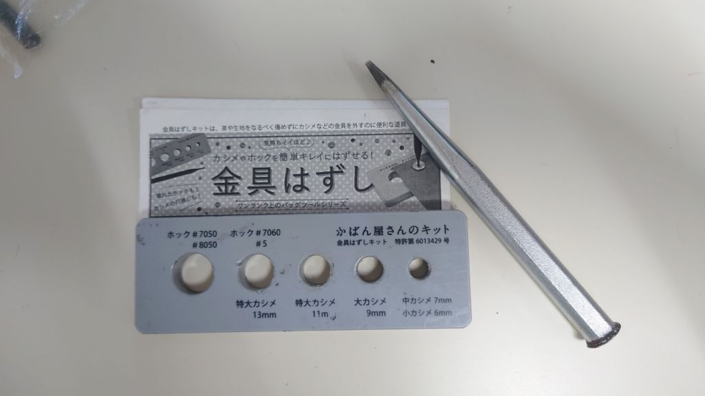 カシメにもサイズがさまざまあるので、その中で合う穴にカシメを置きカシメの穴に先の細くなった部分をさしてかなづちで叩くことでカシメが取れます。簡単に取れるものもありますが中々取れないものは数回叩くと鞄と金具の間に隙間ができるのでそこを杭きりやニッパーを入れてとる場合もあります。ランドセルリメイクでは大活躍する工具になります。普通に鞄を生産しているときには使わなかった工具なので私も知ったときはなるほどな~と思いました。